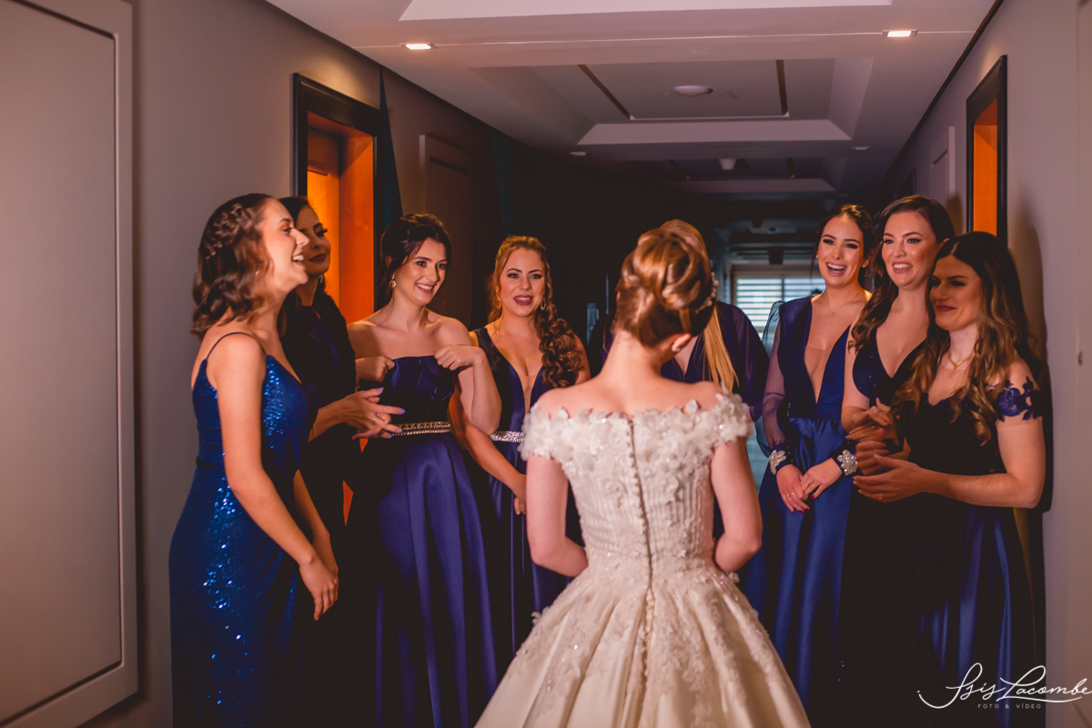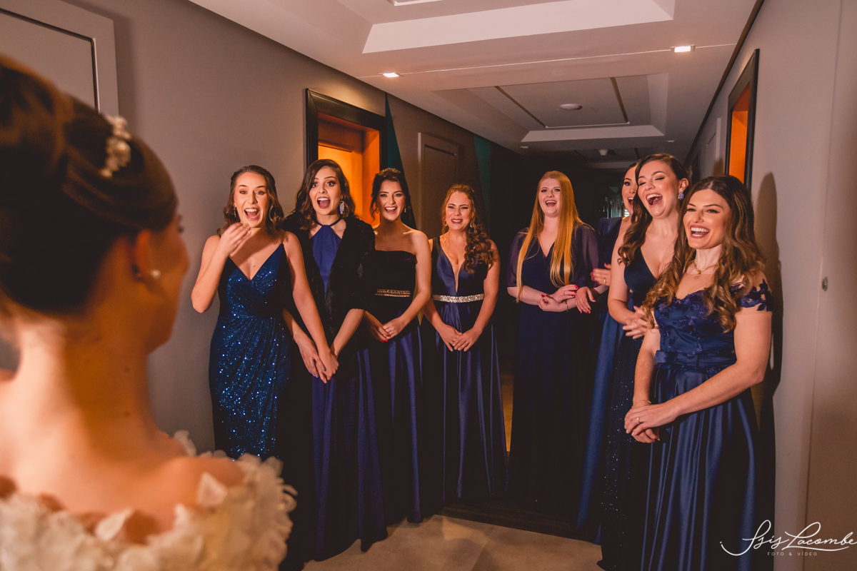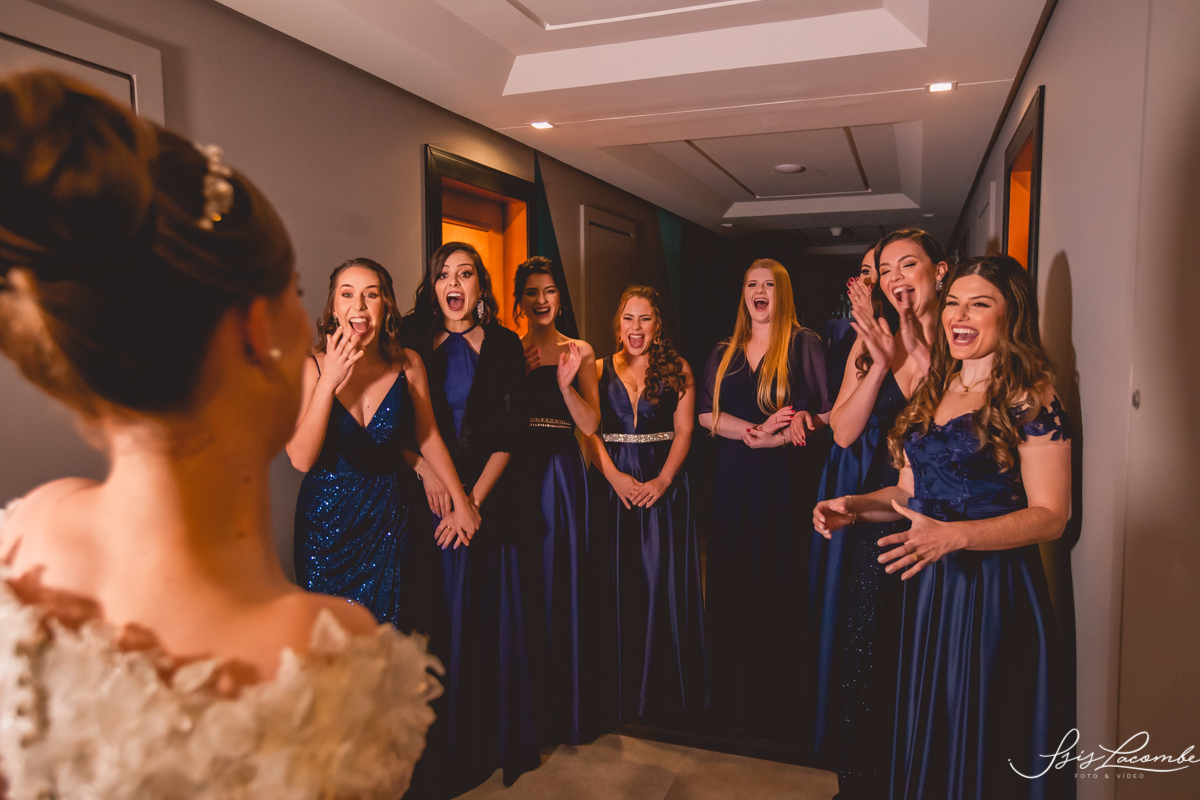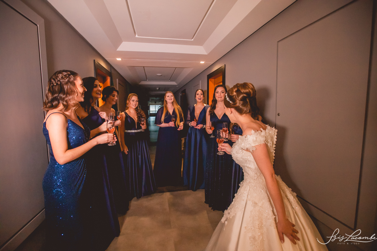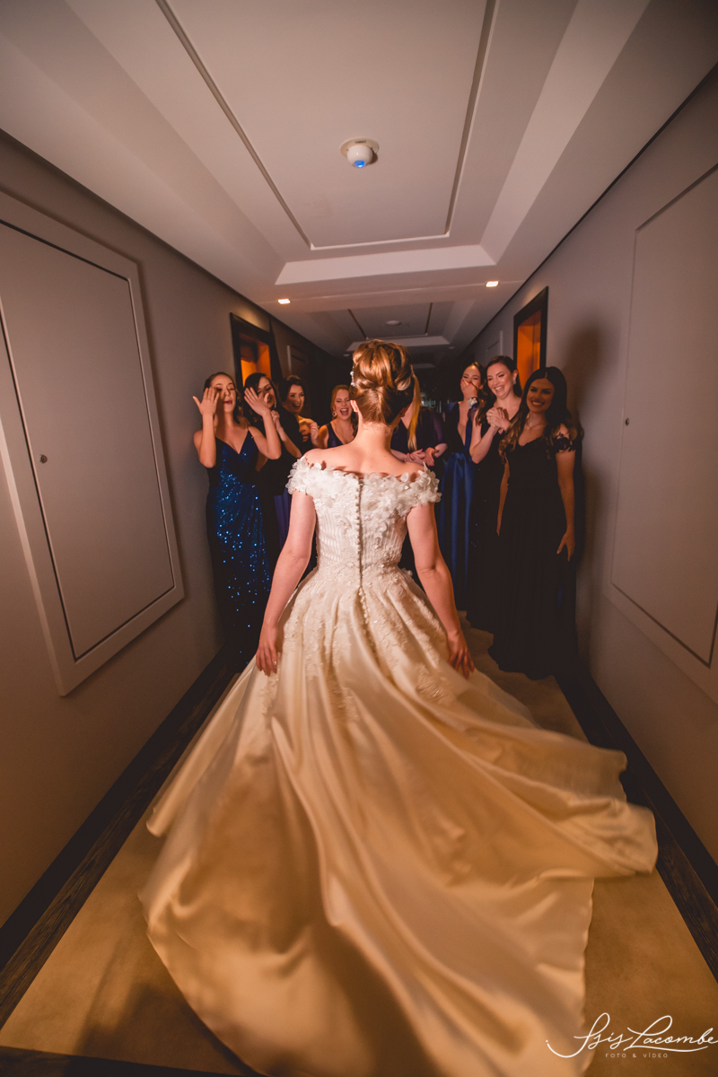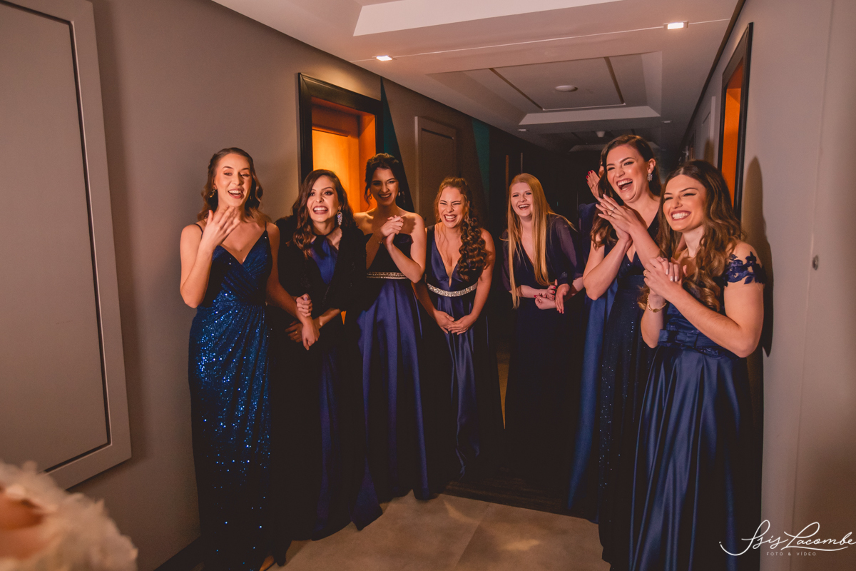 Ela quis fazer um FIRST LOOK com as madrinhas no corredor do Hotel Mercure Convention e eu AMEEEEEEEI, genteeeeem que emocionanteee sério!